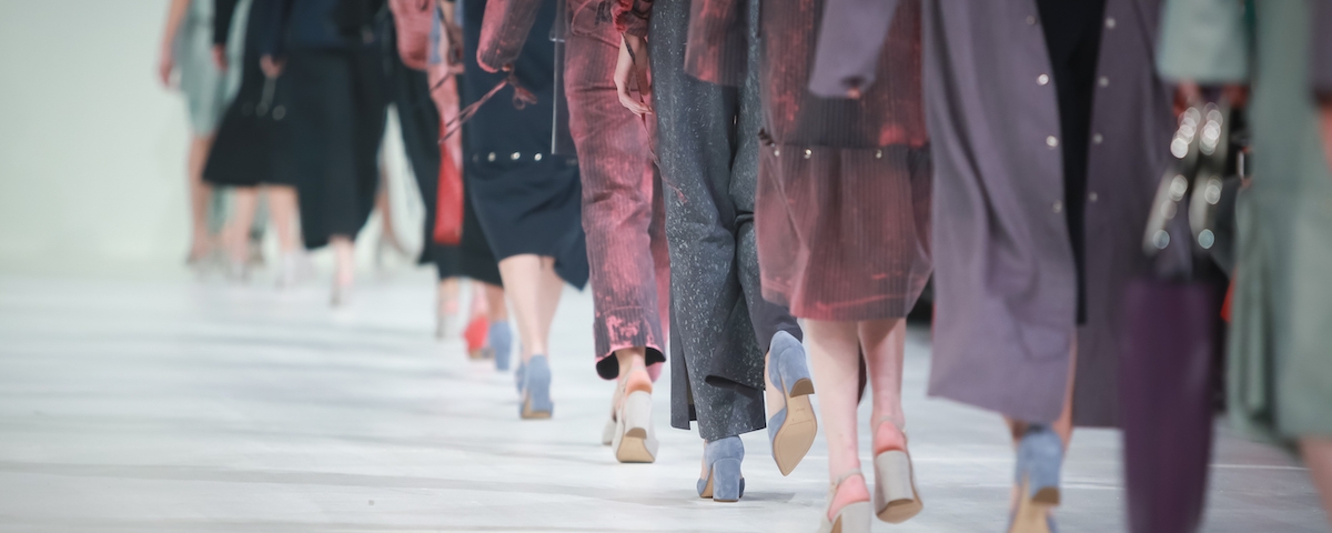 Fashion Show, Catwalk Runway Show Event. Detail of lined up rear view, fashion models.